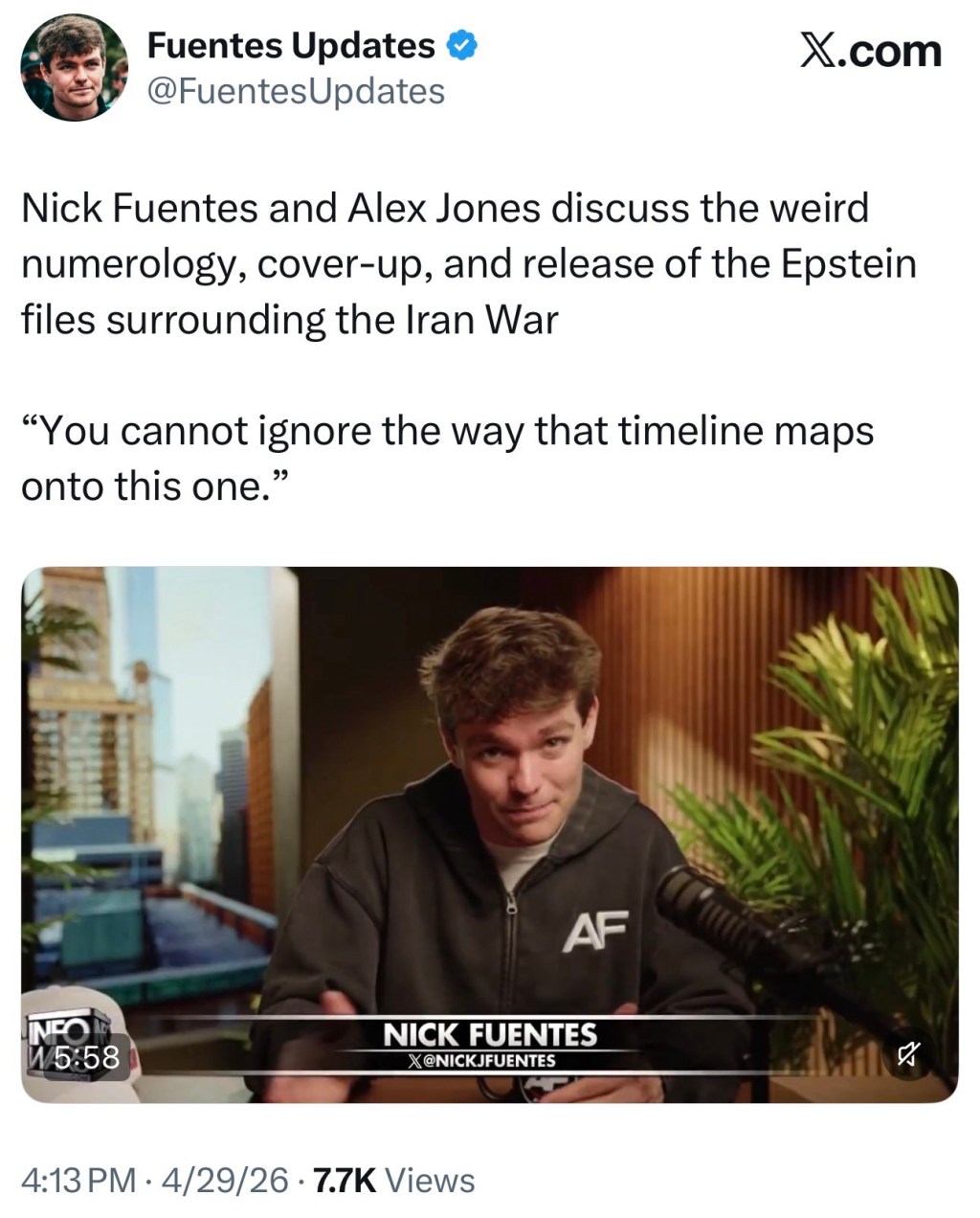 Nick Fuentes and Alex Jones discuss the weird numerology, cover-up, and release of the Epstein files surrounding the Iran War